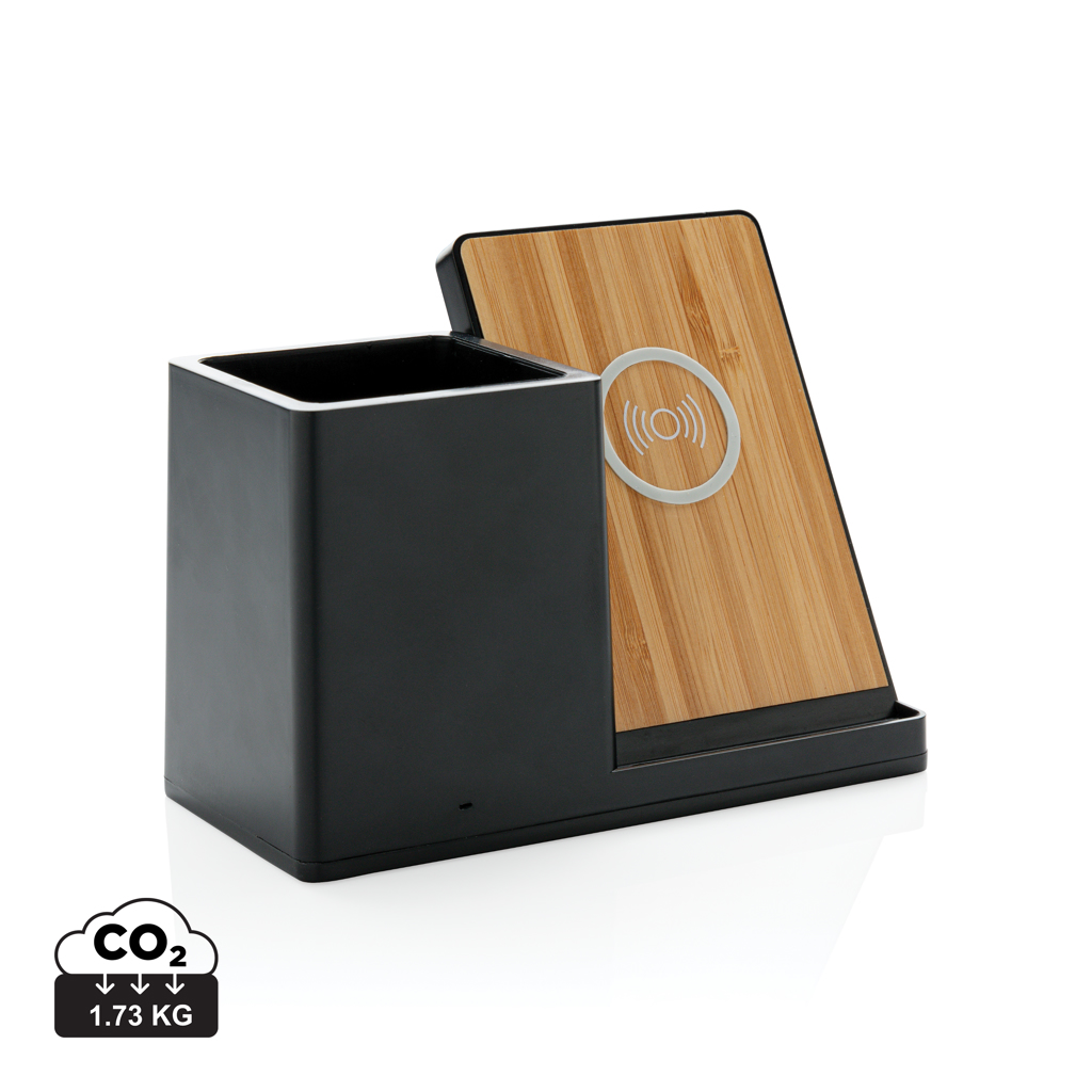 Actualiza tu escritorio con este cargador inalámbrico tan conveniente. Hecho de ABS y madera de bambú 100% natural, este cargador inalámbrico se integra perfectamente en tu escritorio o sala de estar. El cargador inalámbrico dispone de 5W y viene con un cable micro USB de 150 cm para conectarlo a su fuente de alimentación USB. El portalápices es perfecto para guardar objetos pequeños para mantener tu escritorio limpio y organizado. Incluye 2 puertos USB para cargar via USB (5V1A max). Carga inalámbrica compatible con todos los dispositivos habilitados para QI, como la última generación de Android, iPhone 8 y posteriores. Diseño Registrado®