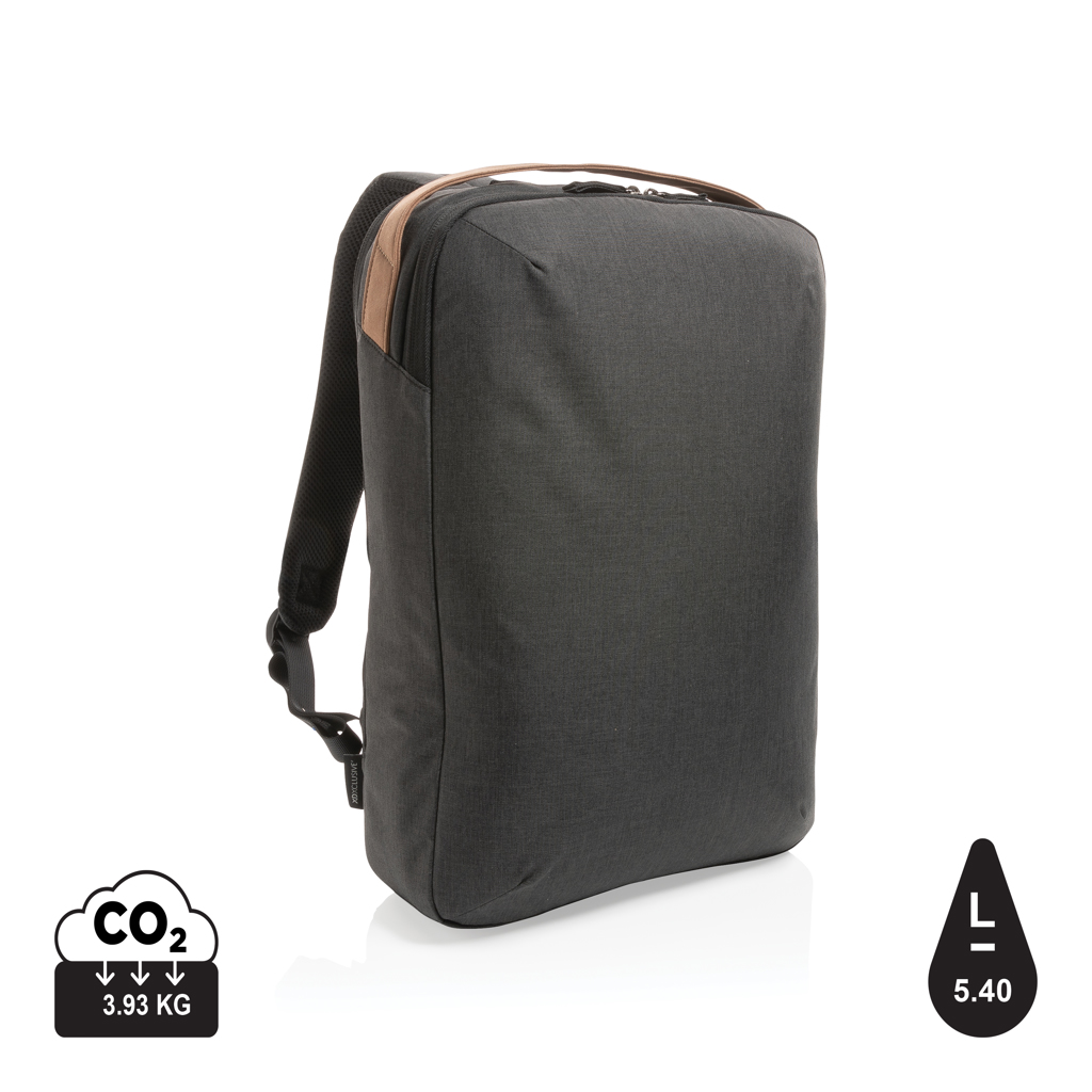 Elegante dentro y fuera de la oficina con esta bonita mochila de diseño minimalista. Disfruta al viajar cómodamente con la mochila que está equipada con correas acolchadas para los hombros y panel trasero. El compartimento principal cuenta con un espacio para portátil de 15,6 pulgadas y dos bolsillos de malla abiertos. En la parte superior puedes encontrar un asa de PU. El material exterior y el forro están fabricados con poliéster reciclado. Con trazador AWARE ™ que valida el uso genuino de materiales reciclados. Cada bolsa ahorra 5,4 litros de agua y ha reutilizado 9,01 botellas PET de 0,5 L. El 2% de las ganancias de cada producto de Impact vendido se donarán a Water.org. Sin PVC.