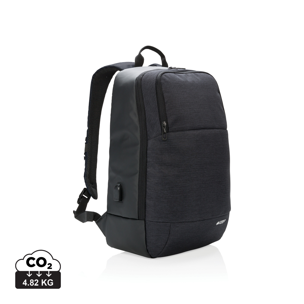 Moderna mochila para portátil 15”. Poliéster de dos tonos con PU. Gran compartimiento principal para tu portátil y un compartimiento frontal. Innovador sistema de succión manos libres en las correas que sostendrá tu teléfono mientras viajas conectado. Conecta tu powerbank fácilmente al puerto de carga USB integrado y carga tu teléfono o tablet en cualquier lugar.