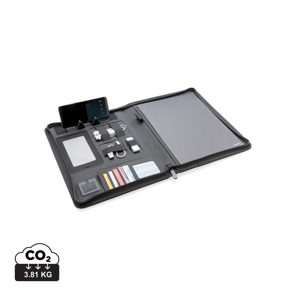 Esta carpeta con bloc de notas de 20 páginas cuenta con la última tecnología. La parte delantera de la funda tiene una placa de carga inalámbrica para tu teléfono. (Últimas generaciones de Android, iPhone 8 y posteriores). Los teléfonos y tablets más antiguos se pueden cargar mediante los puertos USB con la batería externa de 4000 mAh. Sus puertos USB únicos aparecen con el simple clic de un botón. Entrada: 5.0 V/1.0 A Salida: 5.0 V/2.1A. Salida inalámbrica: 5W. Diseño registrado®