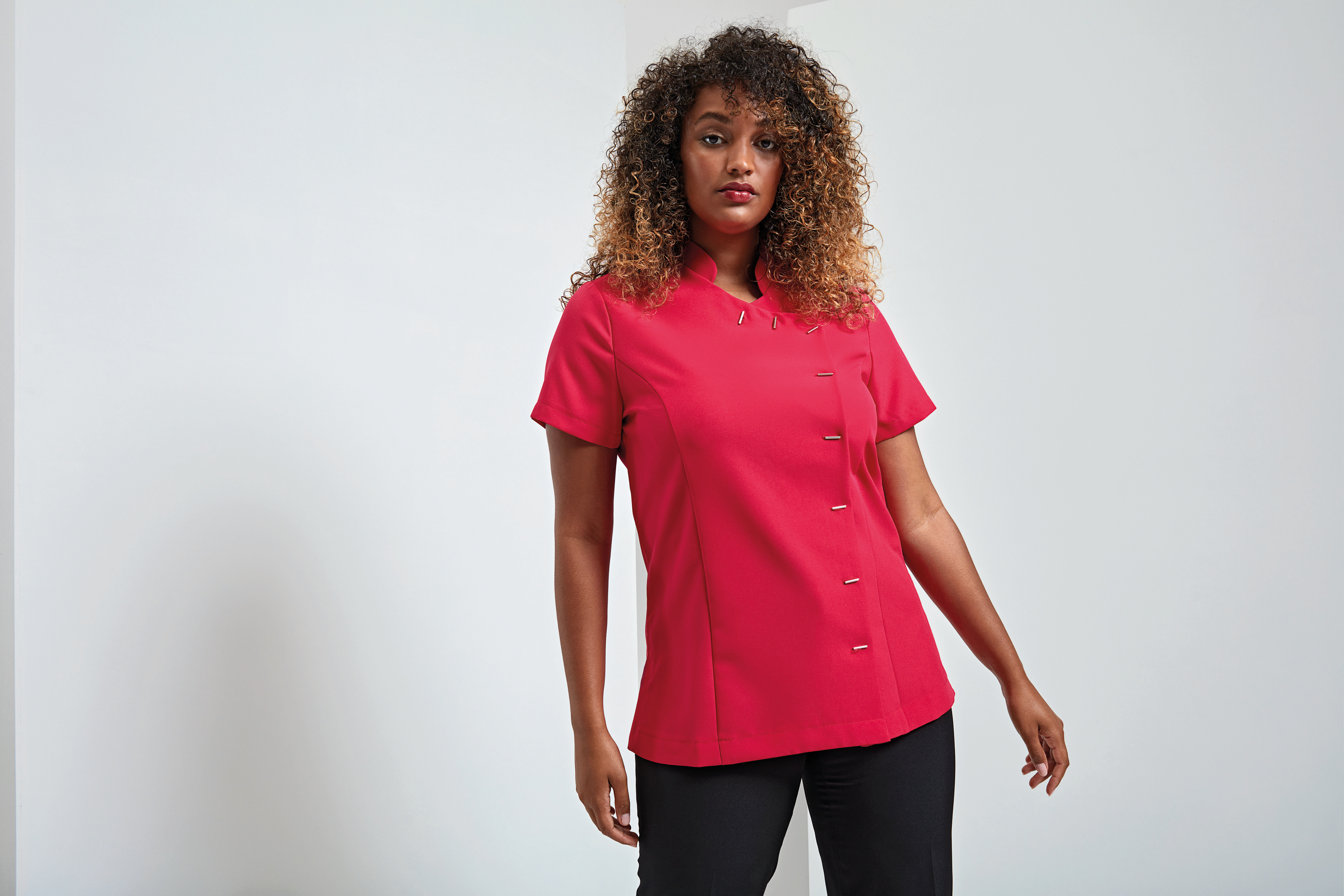 100% poliéster, tejido con efecto stretch. Túnica/Casaca para centro de estética o spa con cuello mao. Manga corta. Sistema de botones asimétrico en la parte delantera con botones en forma de barra. Aberturas laterales. Pliegue en la espalda para facilitar el movimiento. Costuras princesa. Cuidado fácil.